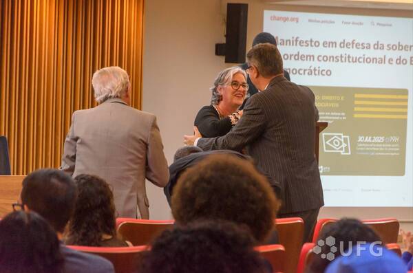 A Universidade Federal de Goiás (UFG), juntamente com diversas instituições parceiras, promoveu na noite de quarta-feira (30/7) o lançamento do “Manifesto em Defesa da Soberania Nacional, da Ordem Constitucional e do Estado Democrático de Direito”. Transmitido ao vivo, o ato foi realizado no Salão Nobre da Faculdade de Direito (FD) e contou com a participação de lideranças acadêmicas, deputados, vereadores e representantes de movimentos estudantis e sindicais para repudiar o que consideram ataques à democracia e à autodeterminação do Brasil.
