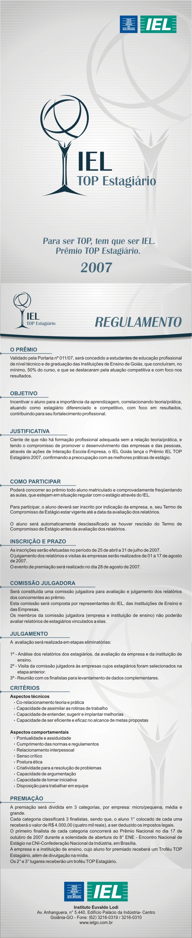 Prêmio Top Estagiário 2007 (inscrições até 31/07) Ereignis Local: IEL - Goiânia - GO Ereignisperiode : 24 April, 2007 at 21:00 - 30 Juli, 2007 at 21:00 TweetWhatsApp Alle auflisten zurück