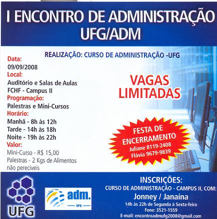 I Encontro de Administração da UFG Événement Local: Câmpus Samambaia Période de l'événement : 08 Setembro 2008 às 21:00 a 01 Novembro 2013 às 12:40 TweetWhatsApp Liste tous Voltar