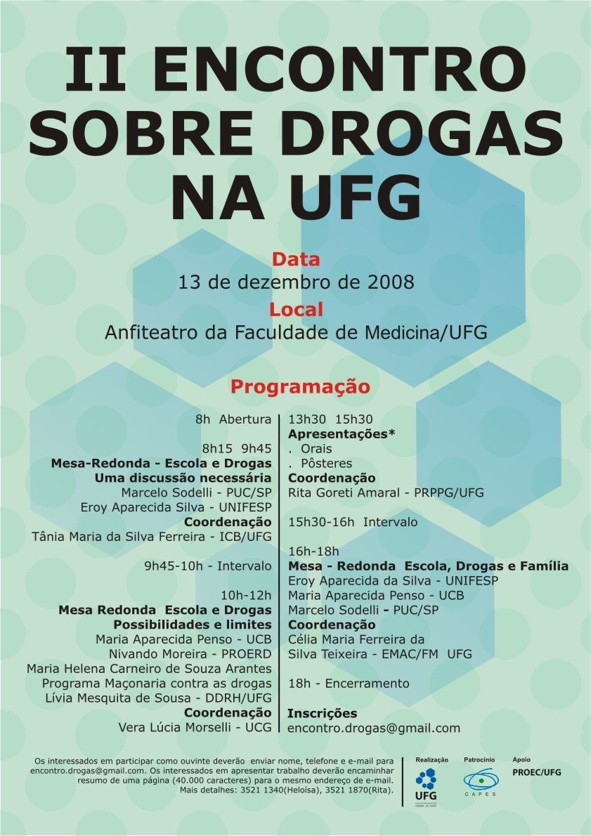 A Pró-reitoria de Pesquisa e Pós-graduação (PRPPG) está organizando, como parte das comemorações de Aniversário da UFG, o II Encontro sobre Drogas na UFG. Este ano o encontro irá discutir o tema Escola e Drogas, no dia 13 de dezembro, no Anfiteatro da Faculdade de Medicina da UFG.
