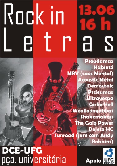 Rock in Letras Event Local: DCE - UFG Event period : June 12, 2009 at 21:00 - November 01, 2013 at 12:40 TweetWhatsApp List all Back