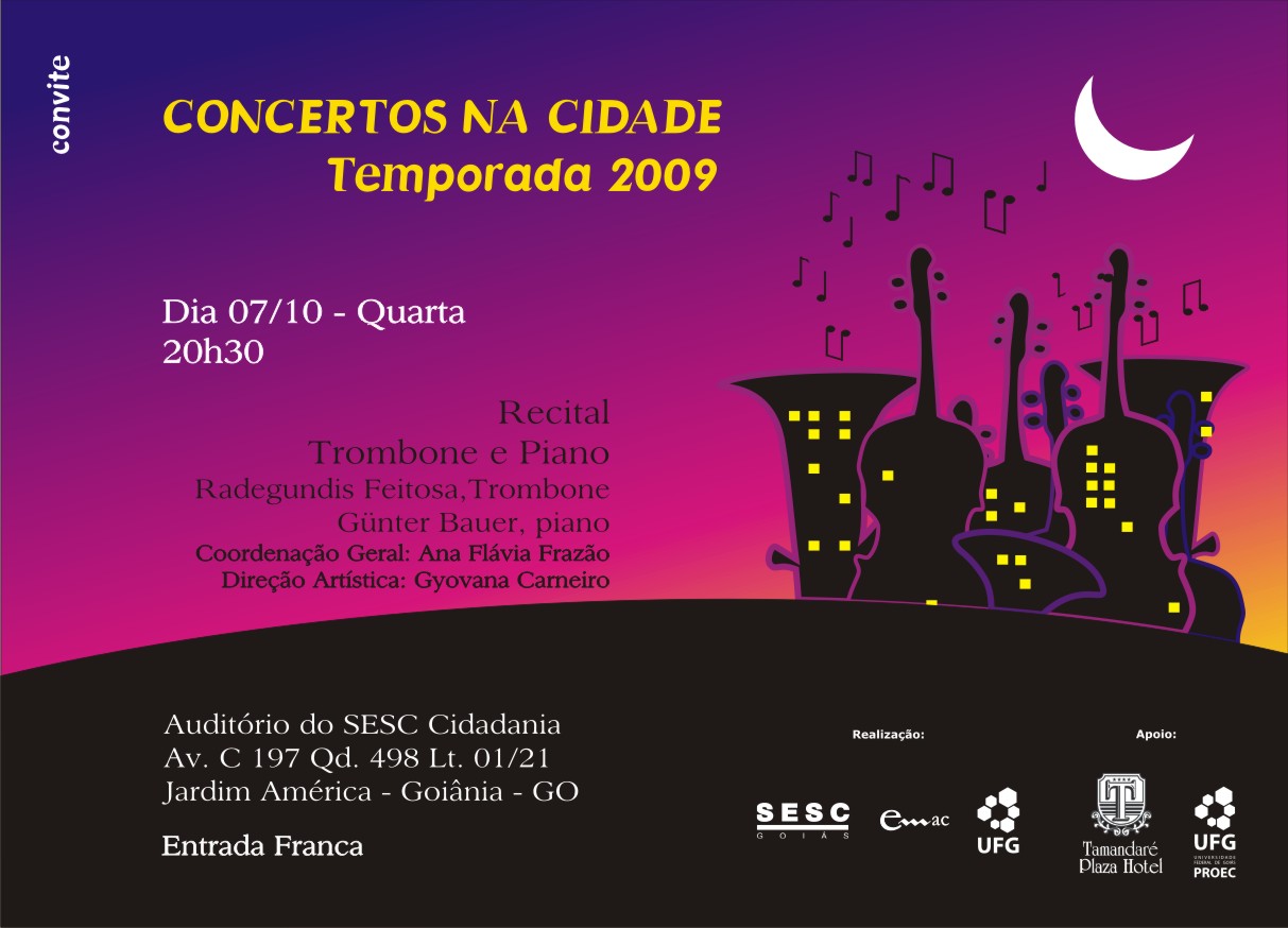 O Concertos na Cidade do mês de outubro apresenta recital de trombone e piano com Radegundis Feitosa (trombone) e Günter Bauer (piano). No dia 7 de outubro, a partir das 20h30, no Auditório do SESC Cidadania. Confira o programa: