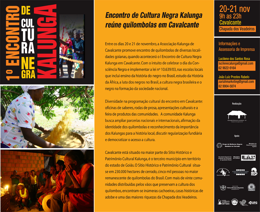 I Encontro de Cultura Negra Kalunga de Cavalcante Event Local: Cavalcante/Goiás Event period : November 19 - 20, 2009 TweetWhatsApp List all Back