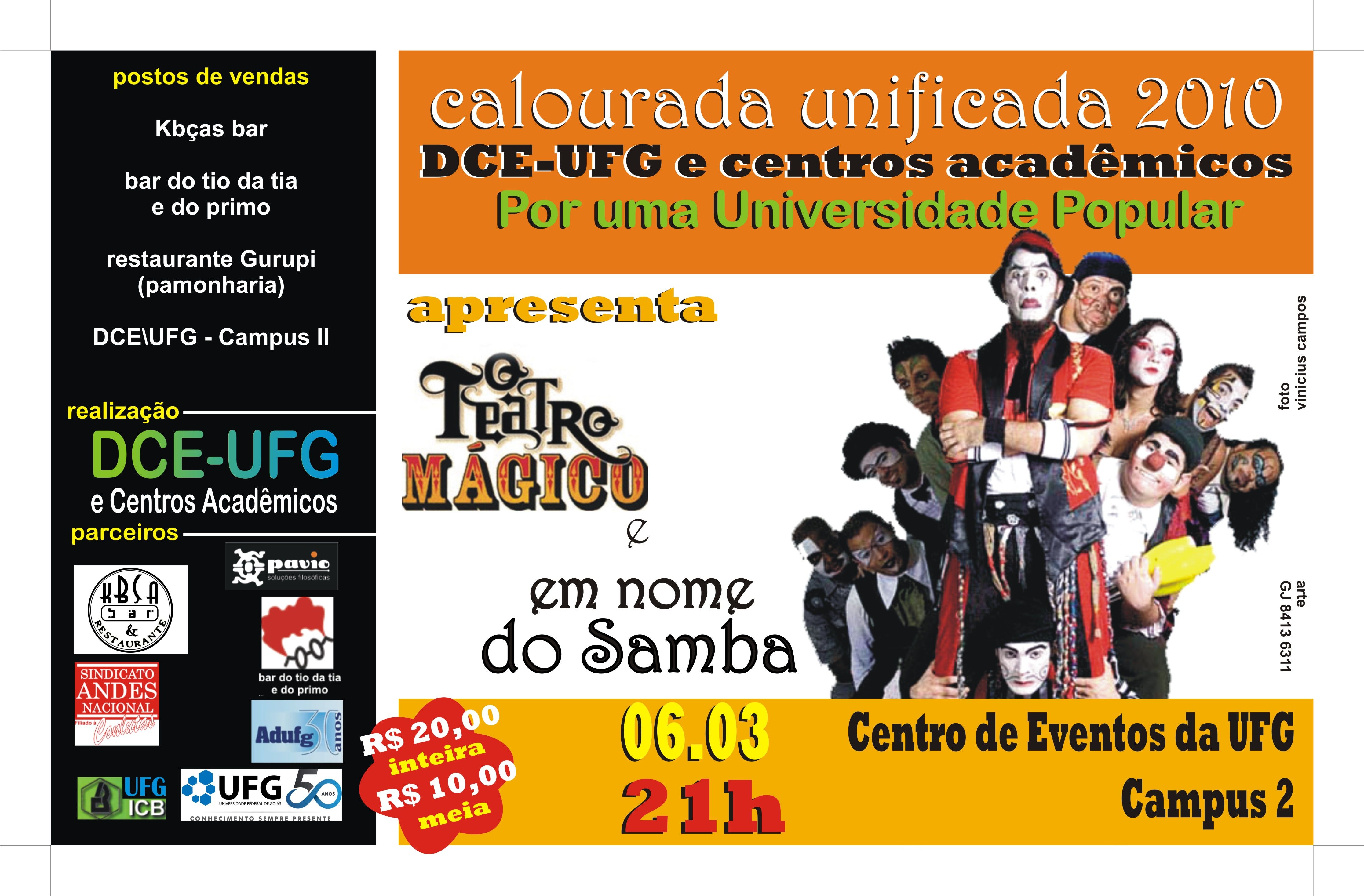 A programação da Calourada 2010 do Diretório Central dos Estudantes (DCE), além de palestras em todos os câmpus da UFG (clique aqui para visualizar a programação completa), também contempla atividades culturais. E será encerrada em grande estilo: com um show do grupo Teatro Mágico no Centro de Cultura e Eventos da UFG, localizado no câmpus II. O show está marcado para o dia 6 de março (sábado), às 21 horas.