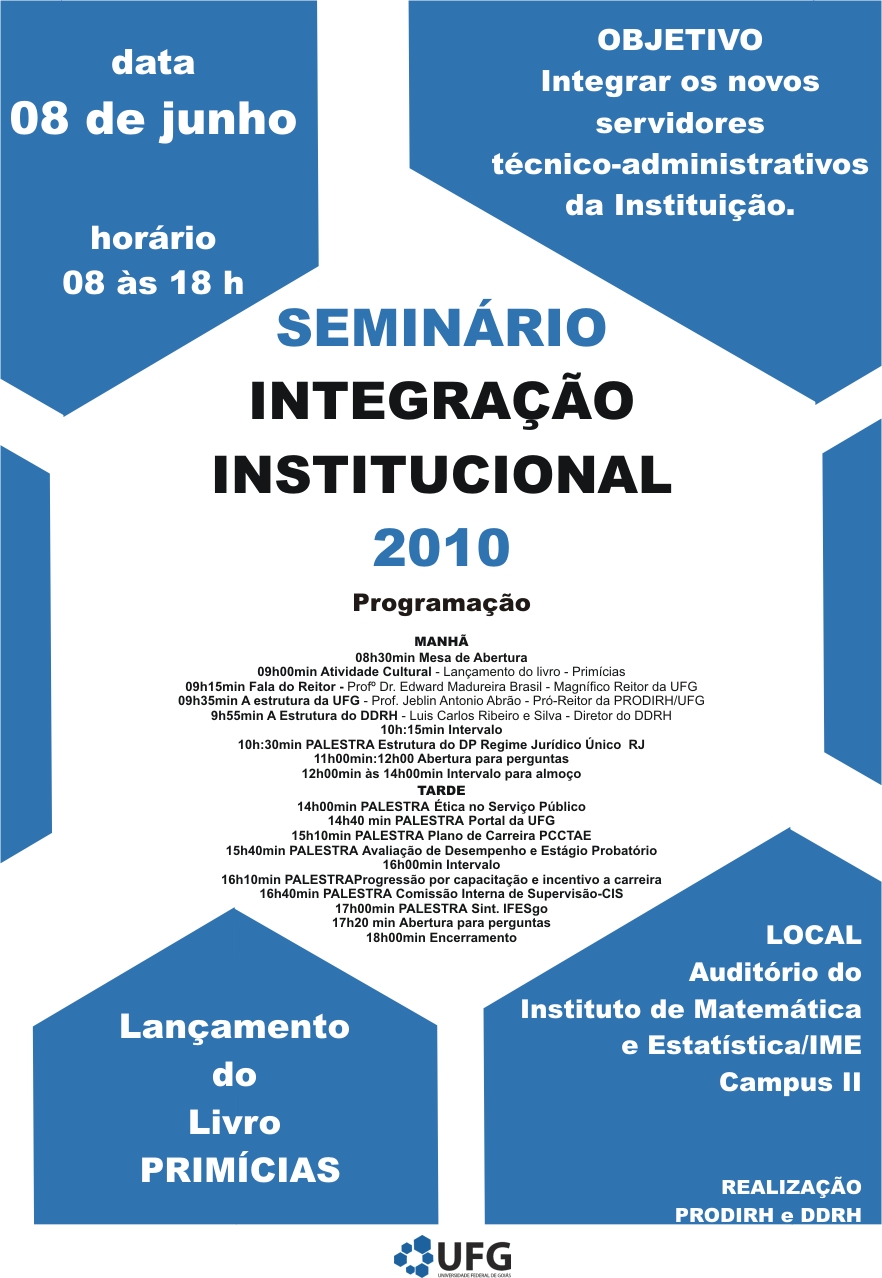 Seminário de Integração Institucional e lançamento do livro Primícias Event Local: Auditório do IME/UFG Event period : June 07, 2010 at 21:00 - November 01, 2013 at 12:40 TweetWhatsApp List all Back