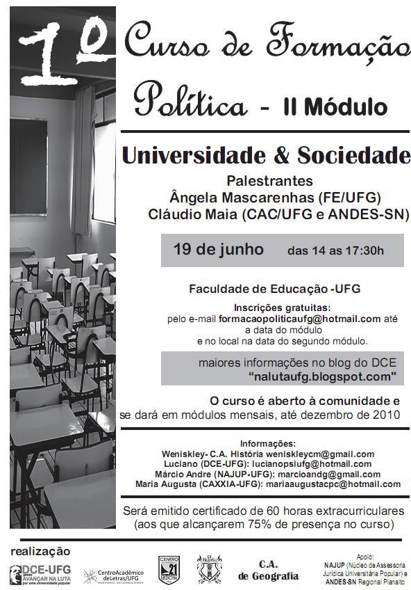 Inscrições pelo e-mail formacaopoliticaufg@hotmail.com ou no local do evento.