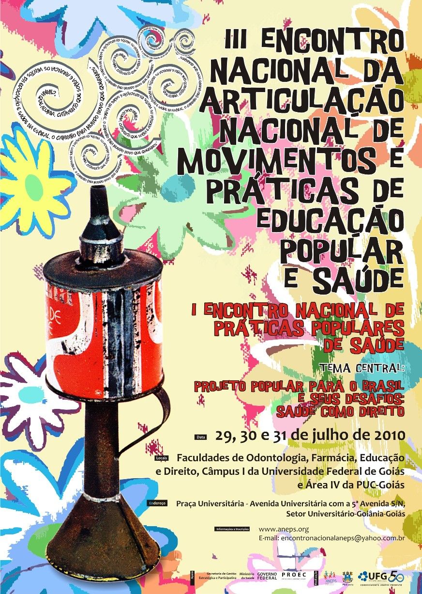 Entre os dias 29 e 31 de julho, Goiânia sedia o III Encontro da Articulação Nacional de Movimentos e Práticas de Educação Popular e Saúde e o I Encontro Nacional de Práticas Populares de Saúde, uma realização da Articulação Nacional de Movimentos e Práticas de Educação Popular e Saúde (ANEPS), em parceria com a Universidade Federal de Goiás (UFG) e com a Pontifícia Universidade Católica de Goiás (PUC-GO). O evento espera reunir cerca de 600 participantes, entre integrantes de movimentos populares de saúde, de comunidades rurais e indígenas, de movimentos de portadores de síndromes, além de gestores e pesquisadores da área de saúde pública e de educação popular e saúde. As atividades serão realizadas em espaços das universidades parceiras localizados no setor Universitário.