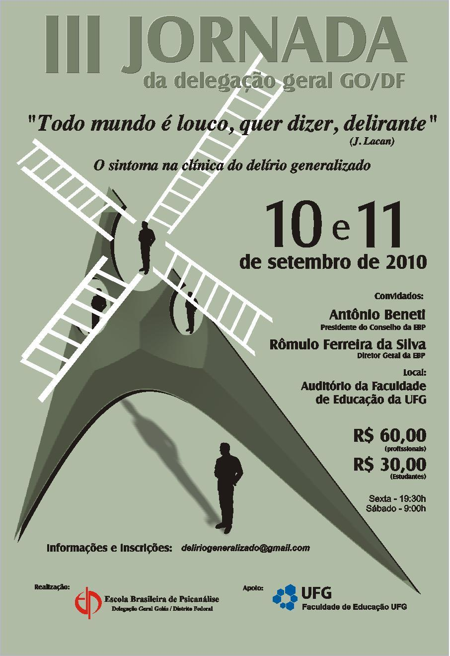 Estão abertas as inscrições para a III Jornada Brasileira de Psicanálise da Delegação Geral GO/DF, que será realizada nos dias 10 e 11 de setembro, no auditório da Faculdade de Educação. O evento terá a participação de Rômulo Ferreira da Silva, diretor da Escola Brasileira de Psicanálise, e de Antônio Beneti, presidente da Escola Brasileira de Psicanálise.