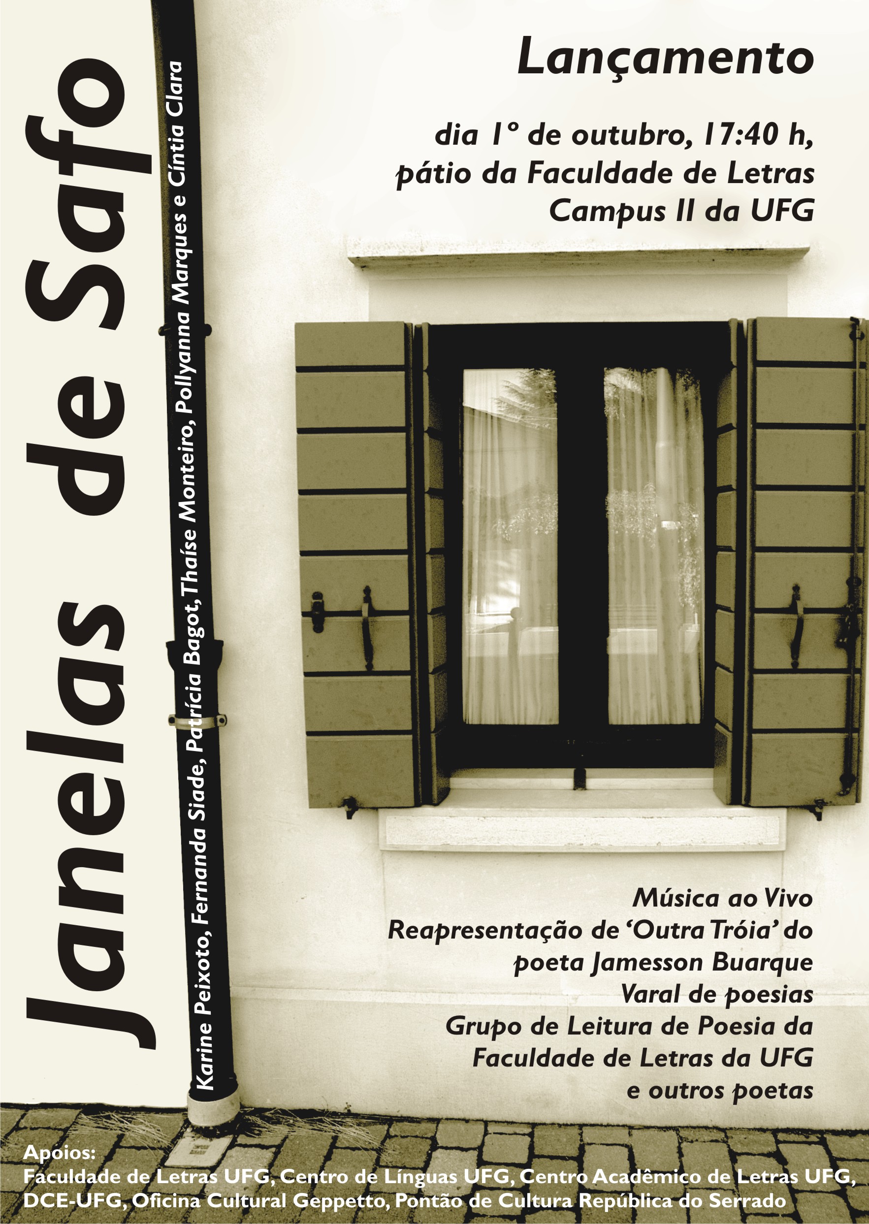 Na sexta-feira (01/10), a partir das 17h40, no pátio da Faculdade de Letras (FL) da Universidade Federal de Goiás, será realizado o lançamento do livro Janelas de Safo. Antologia poética de seis autoras, Karine Peixoto, Fernanda Siade, Patricia Bagot, Thaise Monteiro, Pollyanna Marques e Cintia Clara, o livro é resultado de uma iniciativa do projeto Saúde, Cultura e Cidadania, desenvolvido pela Instituição Sociedade Oásis que, desde 1999, atua na promoção dos Direitos Humanos em Anápolis-GO.