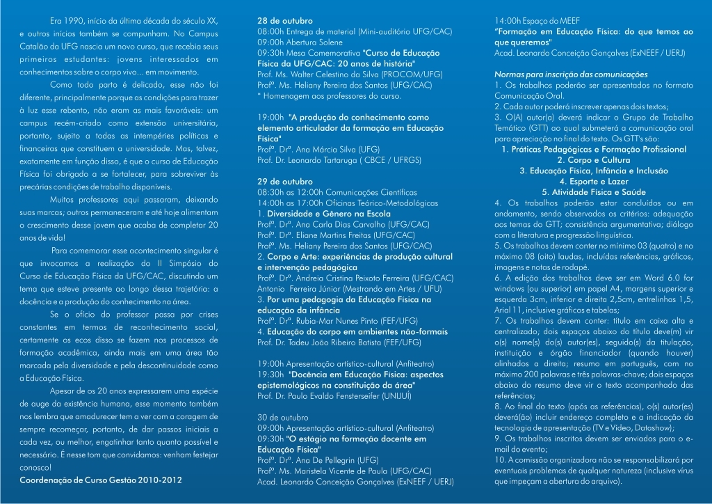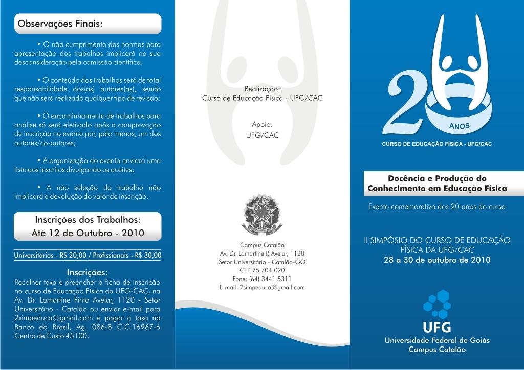 Será realizado no Câmpus Catalão, entre os dias 28 e 30 de outubro, o II Simpósio do Curso de Educação Física do CAC - UFG. O tema do evento será a Docência e produção de conhecimento em Educação Física. O simpósio comemora os 20 anos do curso no Câmpus Catalão.