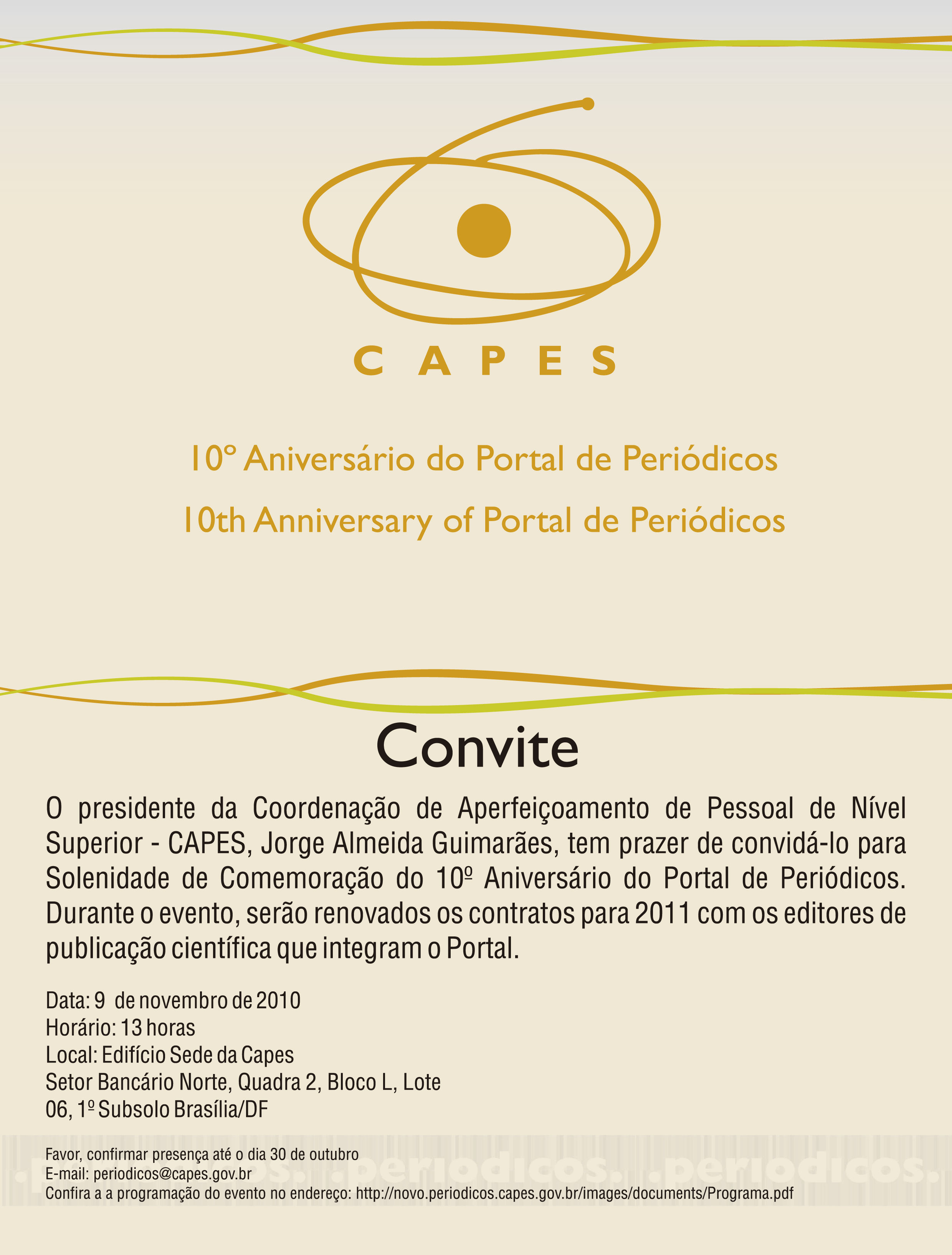 10º Aniversário do Portal de Periódicos Evento Local: Edifício Sede da Capes Periodo evento : 08 novembre 2010 alle 22:00 a 01 novembre 2013 alle 12:40 TweetWhatsApp Elenca tutto Volver