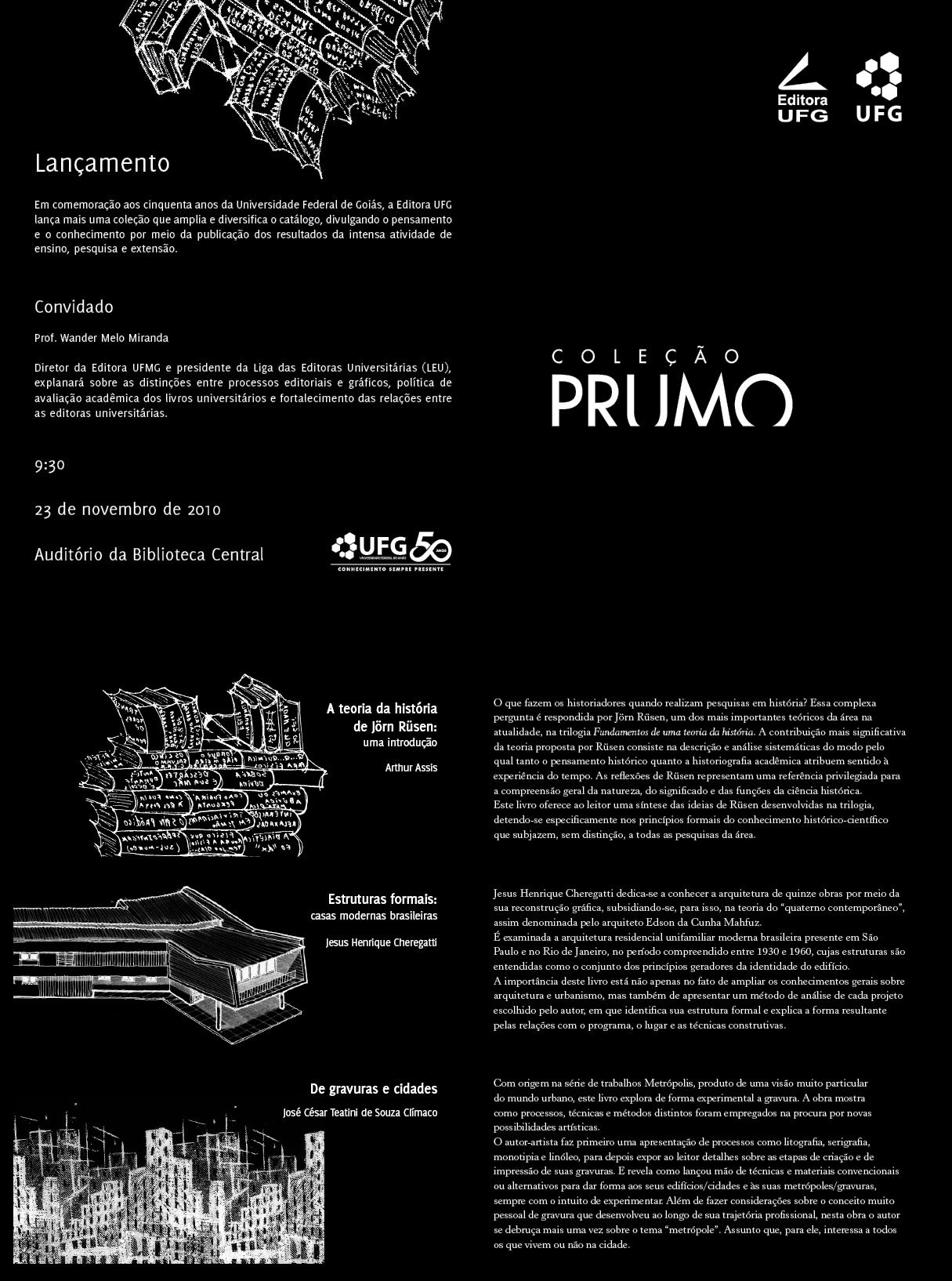 Lançamento dos livros da Coleção Prumo Evento Local: Auditório da Biblioteca Central Periodo evento : 22 novembre 2010 alle 22:00 a 01 novembre 2013 alle 12:40 TweetWhatsApp Elenca tutto Volver