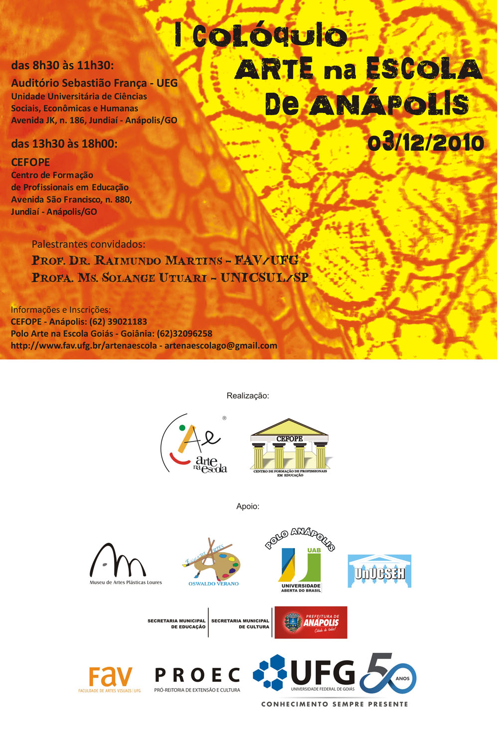 I Colóquio Arte na Escola de Anápolis Event Local: Auditório Sebastião França - UEG Anápolis Event period : December 02, 2010 at 22:00 - November 01, 2013 at 12:40 TweetWhatsApp List all Back