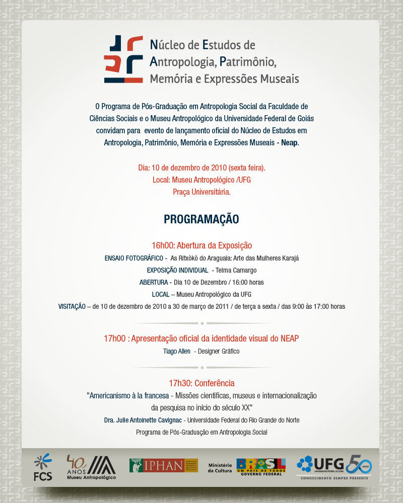 Será lançado oficialmente, no próximo dia 10, o Núcleo de Estudos em Antropologia, Patrimônio, Memória e Expressões Museais – NEAP. O evento, realizado pelo programa de pós-graduação em Antropologia Social da Faculdade de Ciências Sociais em parceria com o Museu Antropológico, ocorrerá a partir das 16 horas e contará com abertura de exposição temporária e conferência, conforme programação abaixo: