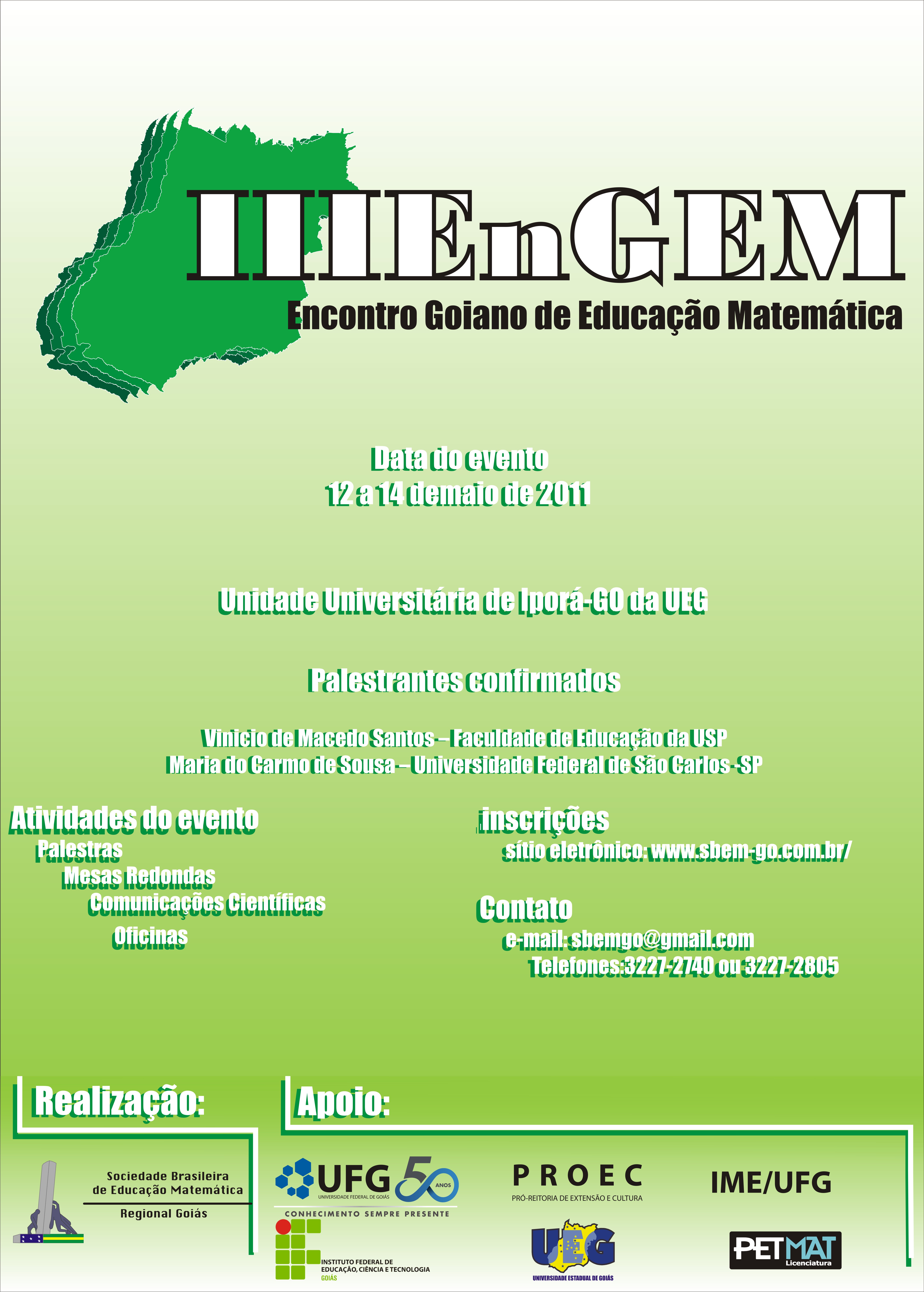A Sociedade Brasileira de Educação Matemática – regional Goiás realizará nos dias 12, 13 e 14 de maio o III Encontro Goiano de Educação Matemáticac (III ENGEM). O evento, cadastrado como projeto de extensão da UFG, conta com a colaboração de professores da UFG e também da Universidade Estadual de Goiás (UEG), do Instituto Federal Tecnológico de Goiás (IFG) e da Pontifícia Universidade Católica (PUC Goiás). A sede do Encontro, este ano, será na UEG - unidade Iporá.
