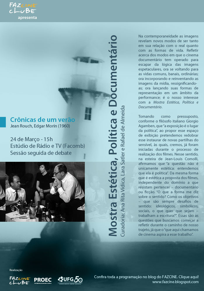 Mostra Estética, Política e Documentário apresenta: Crônicas de um verão Ereignis Local: Estúdio de Rádio e TV da Facomb/UFG Ereignisperiode : 23 März, 2011 at 21:00 - 01 November, 2013 at 12:40 TweetWhatsApp Alle auflisten zurück