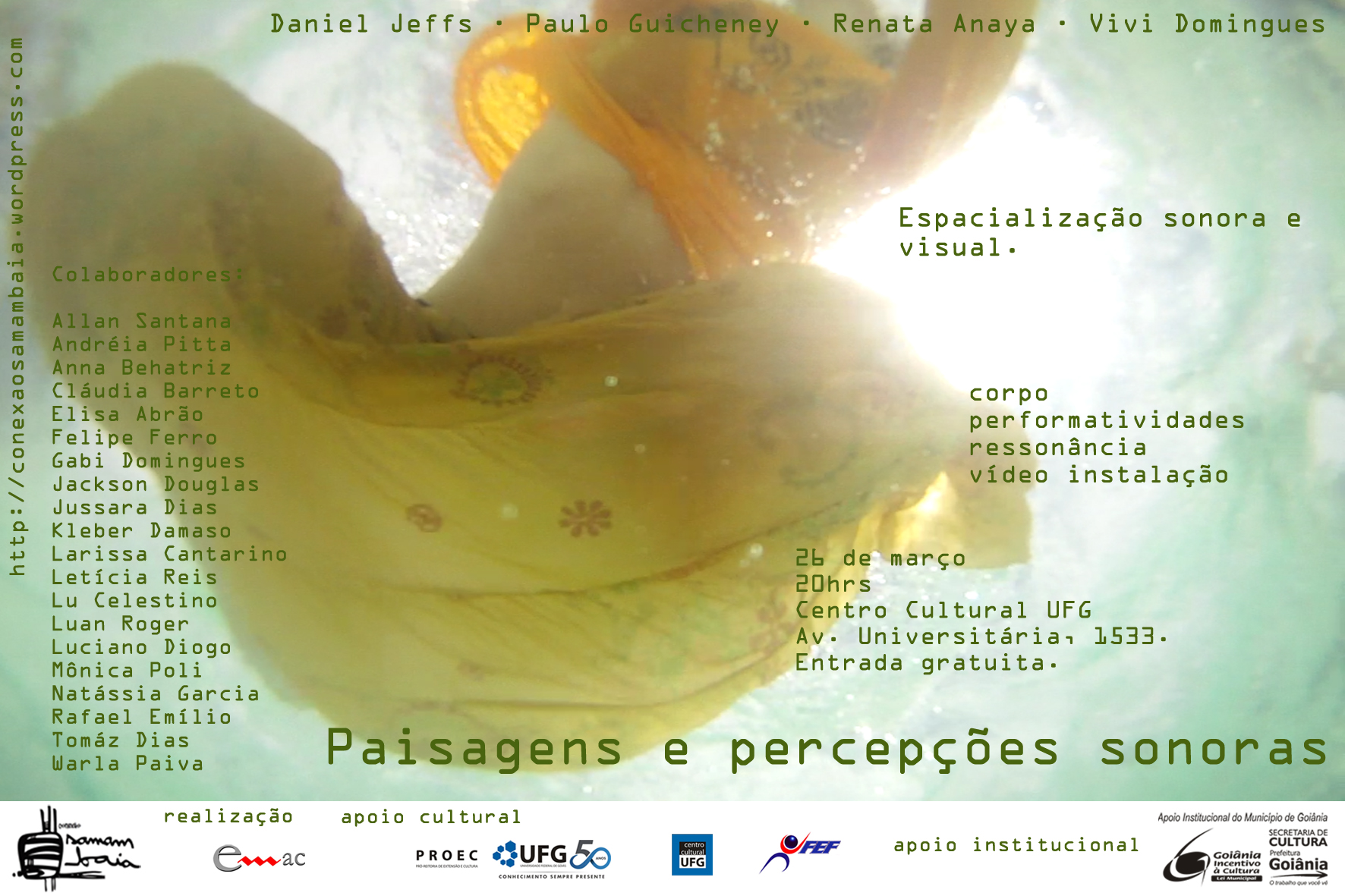 A pesquisa realizada durante o encontro contou com a colaboração de um coletivo de vinte artistas locais, entre performers, atores, bailarinos, músicos e artistas visuais que desenvolveram ações submersas desde a chegada dos convidados, no dia 18 deste mês, para captar movimentos e ressonâncias do corpo na água.