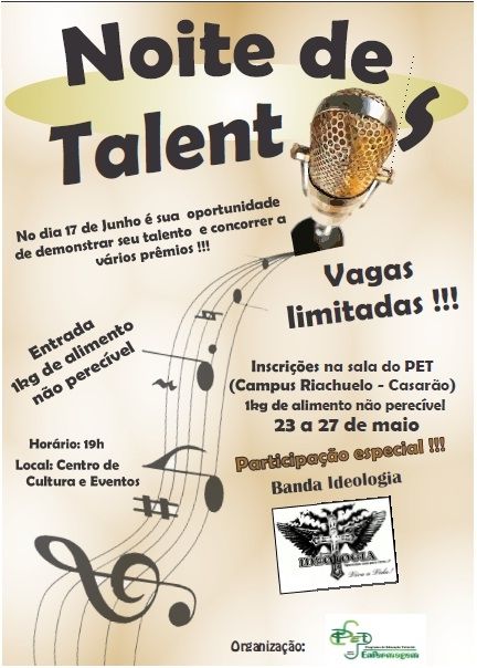 Entre os dias 23 e 27 de maio estarão abertas as inscrições para a Noite de Talentos que será realizada no dia 17 de junho. Além de revelar talentos artísticos o evento arrecadará alimentos para instituições filantrópicas.