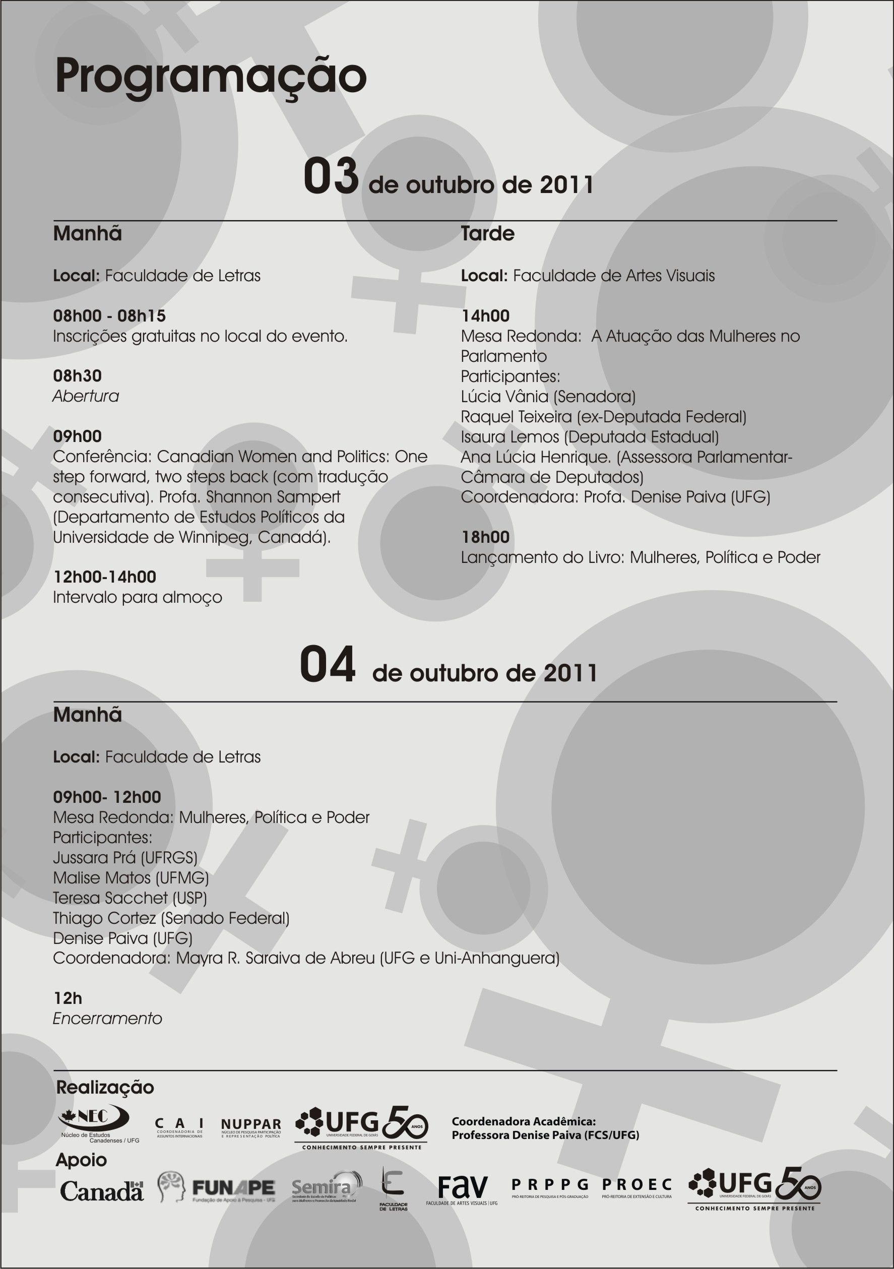 O Núcleo de Estudos Canadenses (NEC-UFG) e a Coordenadoria de Assuntos Internacionais (CAI-UFG), em parceria com o Núcleo de Pesquisa Participação e Representação Política (NUPPAR/UFG), promoverão o Seminário Internacional Mulher e Participação Política: Brasil e Canadá. A professora Denise Paiva (Faculdade de Ciências Sociais/UFG) é responsável pela coordenação acadêmica do seminário, que será realizado nos dias 03 e 04 de outubro de 2011, no câmpus II da Universidade Federal de Goiás.