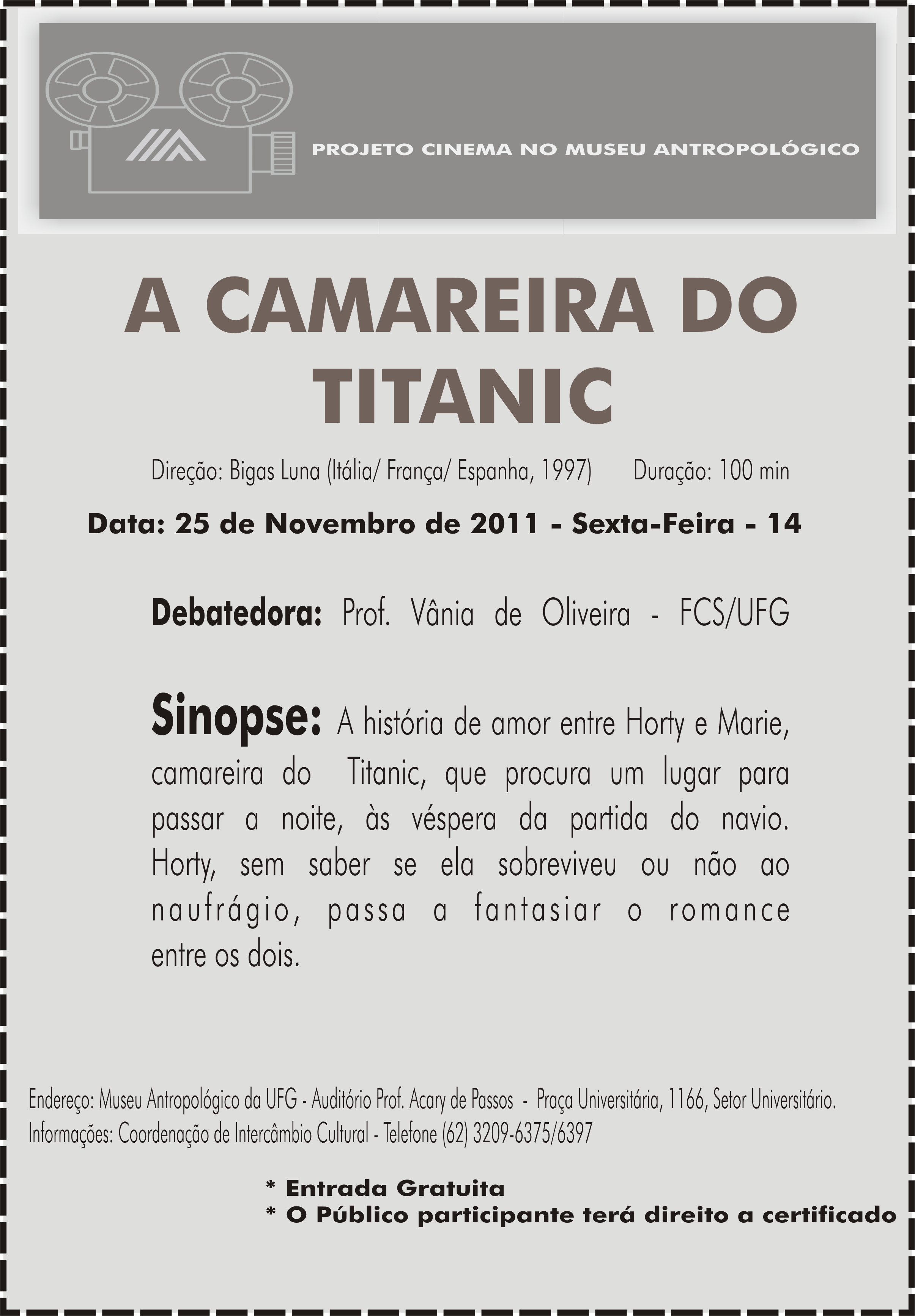 O Projeto Cinema no Museu Antropológico exibe o filme A Camareira do Titanic na próxima sexta-feira, dia 25/11, no Auditório Professor Acary de Passos, localizado no Museu Antropológico. Dirigido pelo cineasta Bigas Luna, o filme tem duração de 100 minutos e narra a história de amor entre Horty e Marie, camareira do Titanic, que procura um lugar para passar a noite, às véspera da partida do navio. Horty, sem saber se ela sobreviveu ou não ao naufrágio, passa a fantasiar o romance entre os dois.