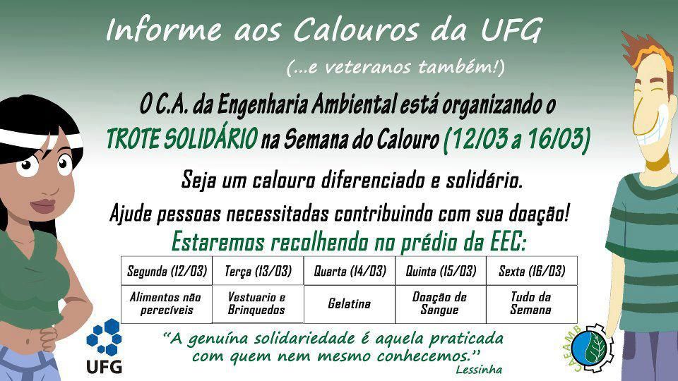 O Centro Acadêmico de Engenharia Ambiental realiza, de 12 a 16 de março, mais uma edição do Trote Solidário. Os estudantes estarão recolhendo, conforme o calendário indicado abaixo, doações de alimentos não perecíveis, gelatina, roupas e brinquedos, e também farão uma campanha de doação de sangue. As ações vão ocorrer no prédio da Escola de Engenharia Civil, na Praça Universitária.