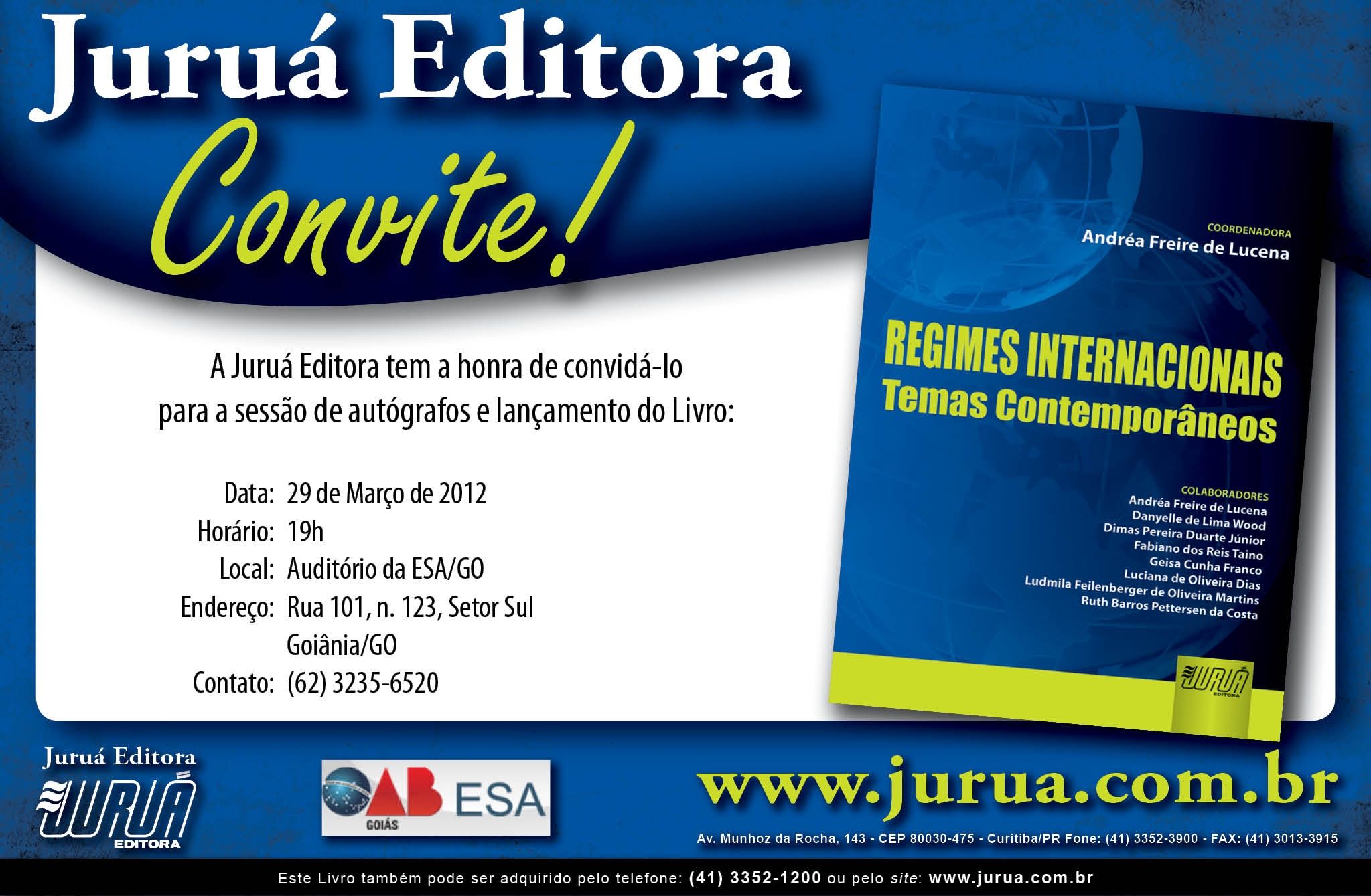 O livro Regimes internacionais – temas contemporâneos será lançado no dia 29 de março de 2012, às 19 horas, no auditório da ESA/GO, localizado na rua 101, n. 123, setor Sul. No livro, os autores discutem as teorias dos regimes internacionais e analisam regimes de direitos humanos e comerciais. O livro é organizado pela professora do curso de Ciência Econômica e do mestrado em Ciência Política da UFG, Andréa Freire de Lucena.