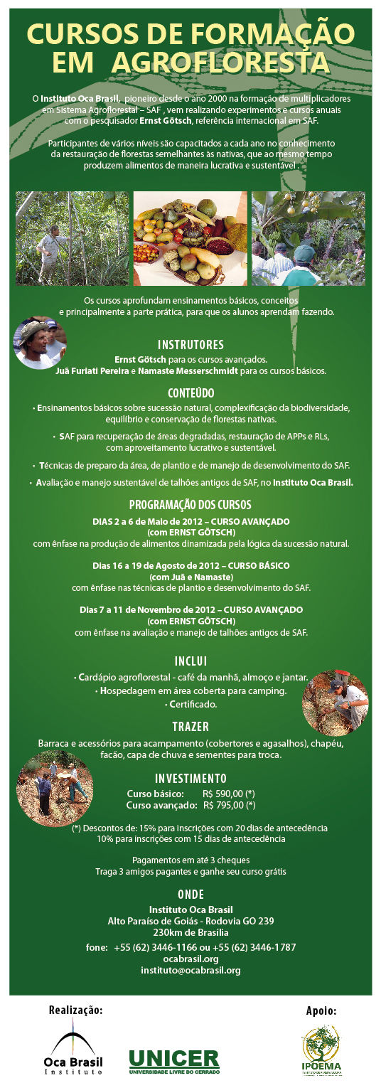 O Instituto Oca Brasil, conveniado com a UFG, promove regularmente cursos básicos e avançados de Formação em Agrofloresta, com o pesquisador Ernst Götsch, referência internacional em Sistemas Agroflorestais (SAF).