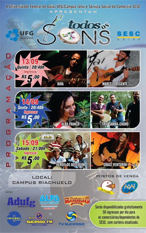 Festival Todos os Sons - Jataí Ereignis Local: Câmpus Riachuelo - Jataí Ereignisperiode : 12 - 14 September, 2012 TweetWhatsApp Alle auflisten zurück