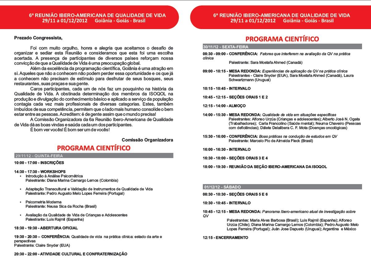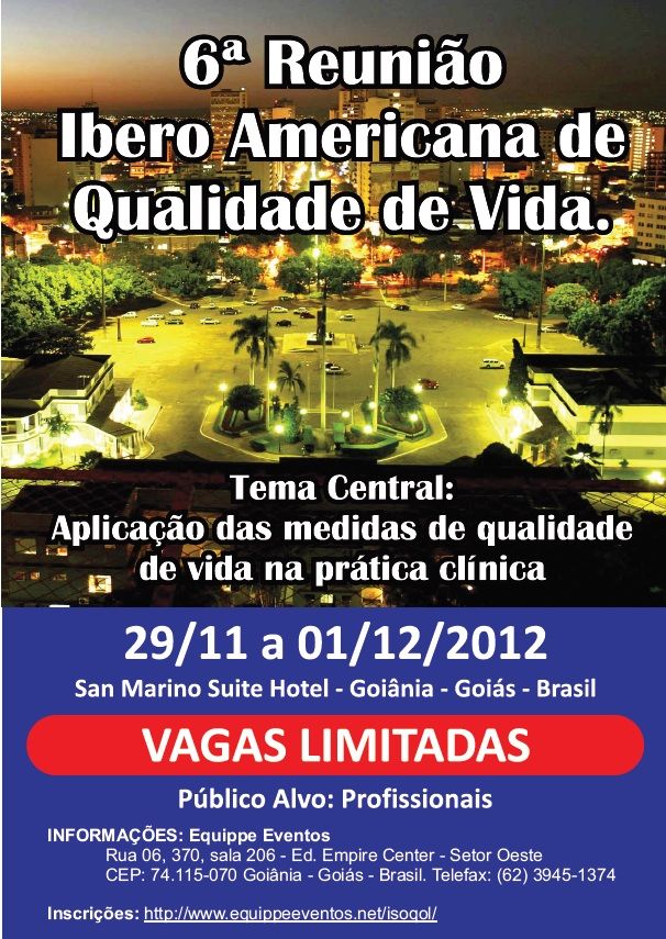 6ª Reunião Ibero-Americana de Qualidade de Vida Evento Local: San Marino Suite Hotel - Goiânia Período do Evento : 28 a 30 de Novembro 2012 TweetWhatsApp Listar Todas Voltar