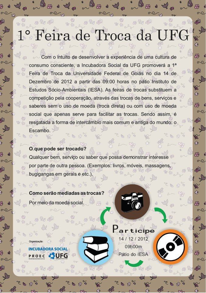 Você quer trocar um livro por uma roupa, um móvel por um eletrodoméstico, ou uma bugiganga por uma sessão de massagem? Essas formas de intercâmbio (e muitas outras) serão possíveis na 1ª Feita de Troca da Universidade Federal de Goiás, que ocorre nesta sexta-feira (14), das 9h às 18h, no pátio do Instituto de Estudos Socioambientais (IESA), organizada pela Incubadora Social da UFG.