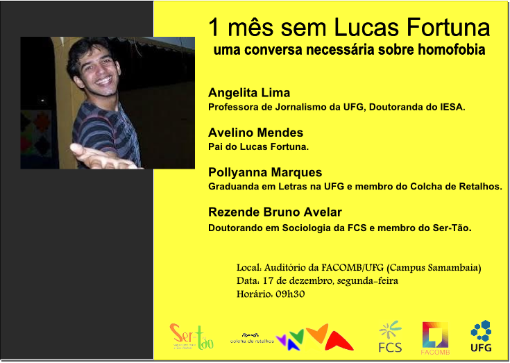 A UFG convida toda a comunidade para "uma conversa necessária sobre homofobia", debate que será realizado na Faculdade de Comunicação e Biblioteconomia (Facomb), no dia 17/12, segunda-feira, a partir das 9h30. O evento é uma homenagem ao jornalista e egresso da universidade, Lucas Fortuna, assassinado em Recife (PE) no dia 10/11.