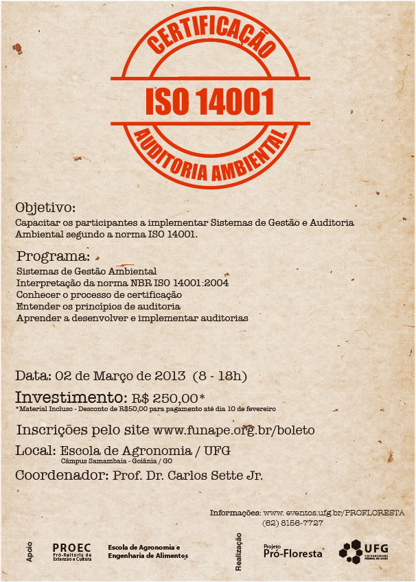Curso Certificação Auditoria Ambiental - Inscrições abertas Événement Local: Escola de Agronomia/UFG Période de l'événement : 01 Março 2013 às 21:00 a 01 Novembro 2013 às 12:40 TweetWhatsApp Liste tous Voltar