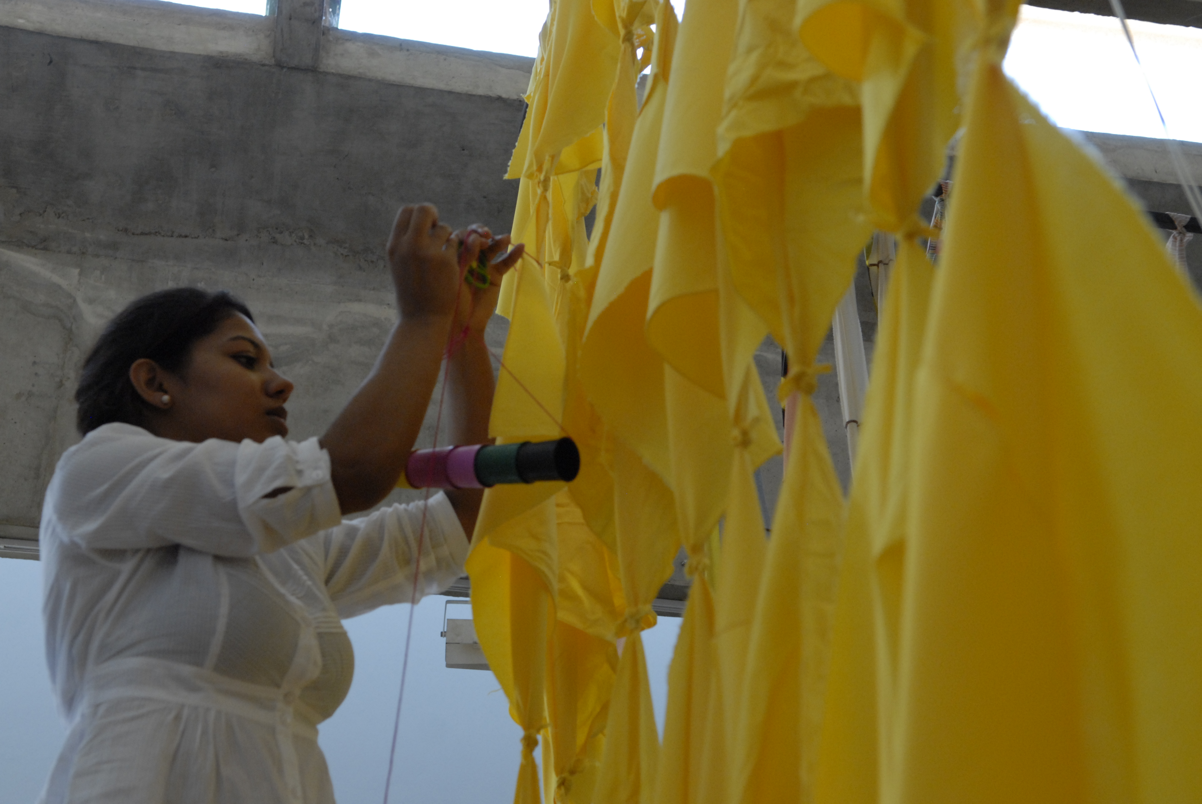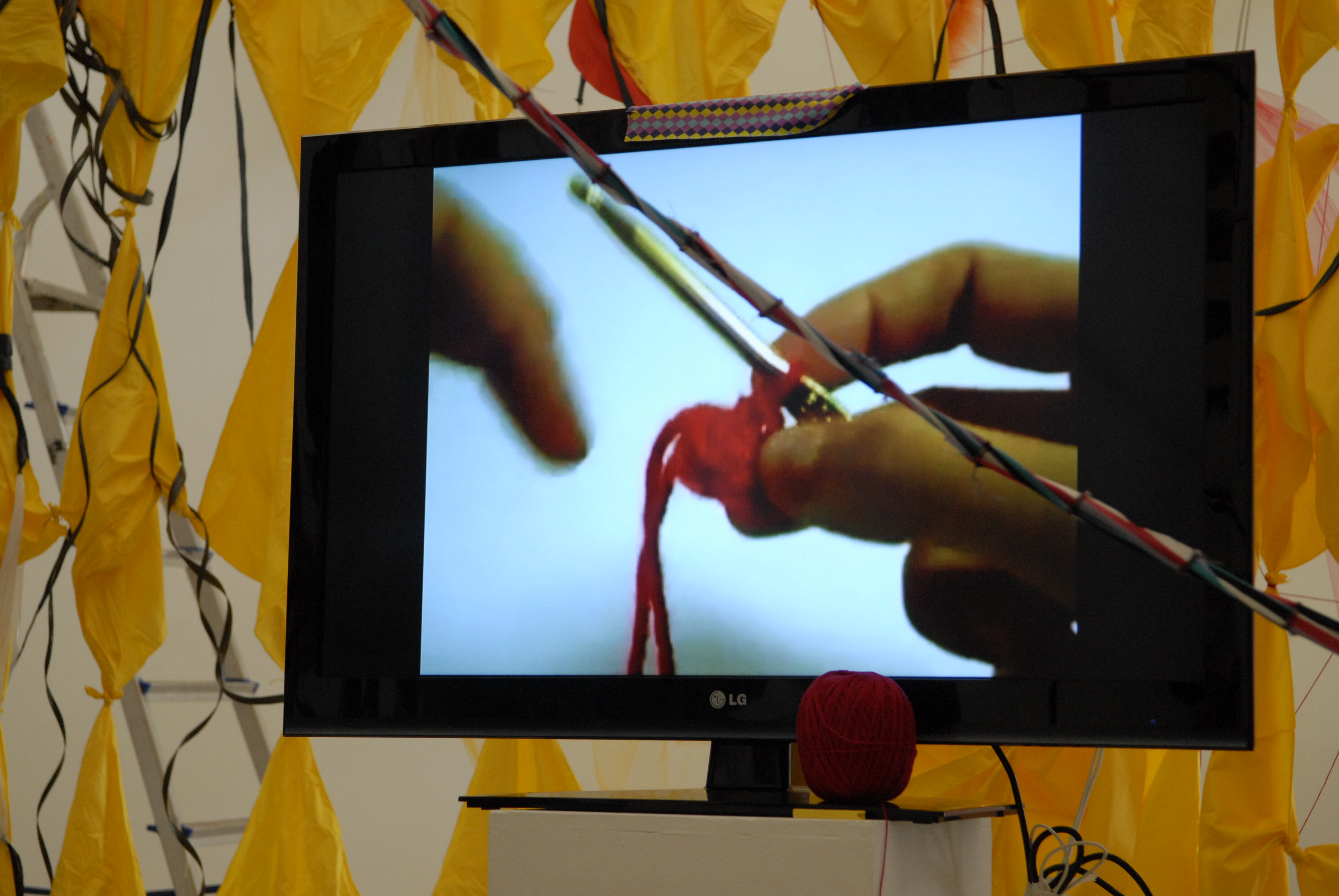 Quem visitar a Galeria da FAV entre os dias 19 de fevereiro e 5 de março encontrará uma grande quantidade de fios de diversas naturezas, como cordões, cordas, fitas cassete, retalhos de tecidos emendados, plásticos, entre outros materiais. Tudo isso está à disposição dos visitantes, que, ao entrarem no espaço, passam a ser potenciais transformadores, sendo chamados a participar efetivamente da exposição ‘NÓS & NÓS’. A exposição é uma instalação proposta e organizada pelos professores da Faculdade de Artes Visuais (FAV) Alice Fátima Martins, Cleomar Rocha e Quéfren Crillanovick. Não se trata de uma exposição coletiva, mas de uma proposta, que será construída em grupo por meio de interações feitas nos materiais disponíveis na galeria e por outros materiais agregados à exposição pelo público participante.