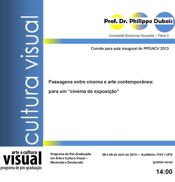 Programa de Pós-Graduação Em Arte e Cultura Visual - Mestrado e Doutorado da Faculdade de Artes Visuais convida para a aula inaugural  2013-1: "Passagens entre cinema e arte contemporânea: para um 'cinema de exposição'", com Philippe Dubois. A palestra será realizada nos dias 8 e 9 de abril às 14 horas, no auditório da FAV, no prédio novo.