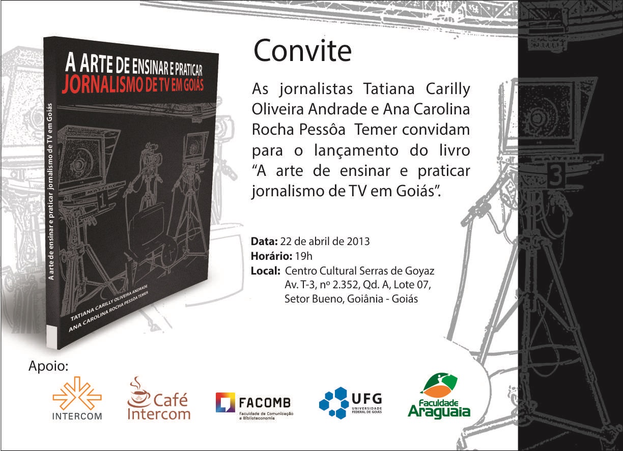 A jornalista e professora da Facomb,  Ana Carolina Pessoa Temer, e a jornalista mestre pela Facomb, Tatiane Carilly, convidam para o lançamento do livro: A arte de ensinar jornalismo de TV em Goiás. O lançamento será realizado no dia 22 de abril, às 19h no Centr Cultural Serras de Goyaz.