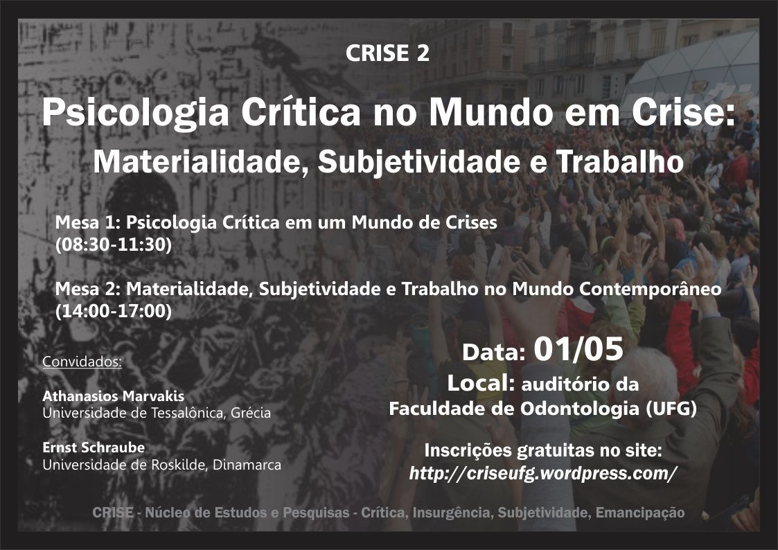 Projeto Crise - Núcleo de Estudos e Pesquisas (Crítica, Insurgência, Subjetividade, Emancipação) realizará evento para discutir Psicologia Crítica no mundo em crise: materialidade, consumo e trabalho. Serão realizadas duas messas redondas no dia 1º de maio, no auditório da Faculdade de Odontologia. Os convidados são Athanasios Markavis, da Grécia e Ernst Schraube, da Dinamarca. As inscrições são gratuitas e podem ser feitas pelo site