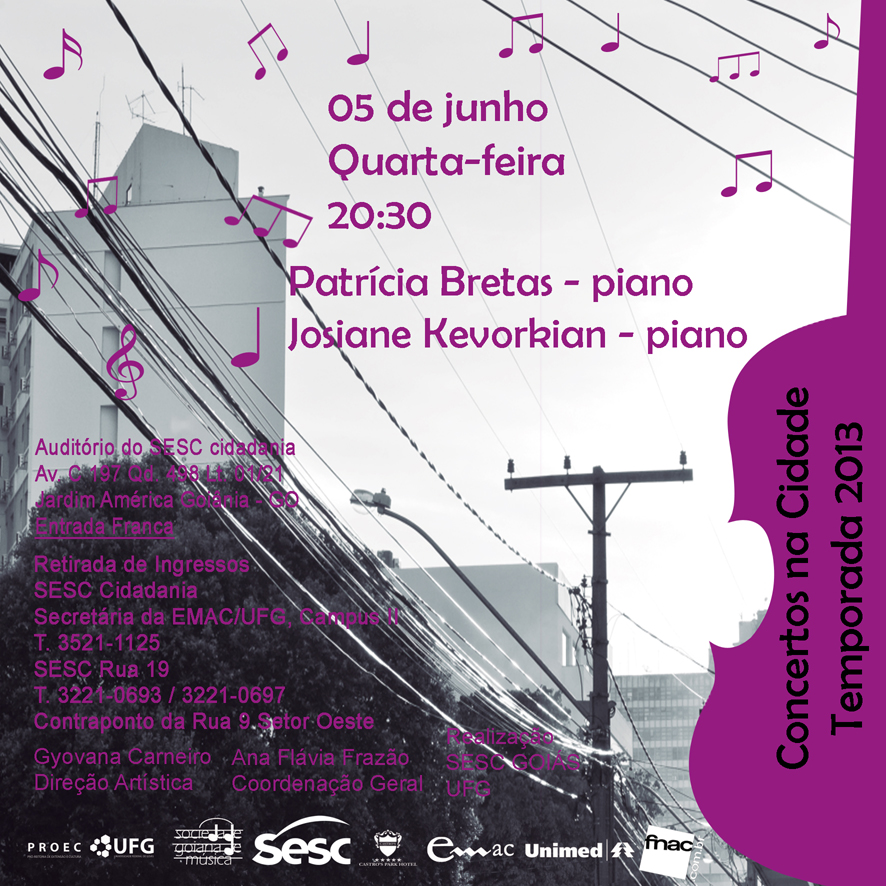 O Projeto Concertos na Cidade - Temporada 2013 recebe Patrícia Bretas (piano) e Josiane Kevorkian (piano). O concerto será realizado no dia 5 de maio, às 20:30h, no auditório do Sesc Cidadania. A entrada é franca e a retirada dos ingressos deve ser feita no Sesc Cidadania ou na secretaria da Emac.