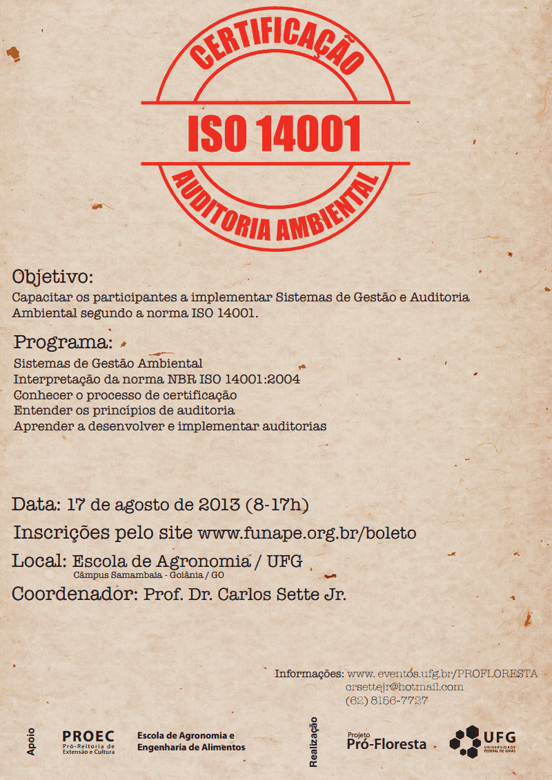 Curso Certificação ISO 14001 - Auditoria Ambiental Evento Local: Escola de Agronomia da UFG Periodo evento : 16 agosto 2013 alle 21:00 a 01 novembre 2013 alle 12:41 TweetWhatsApp Elenca tutto Volver