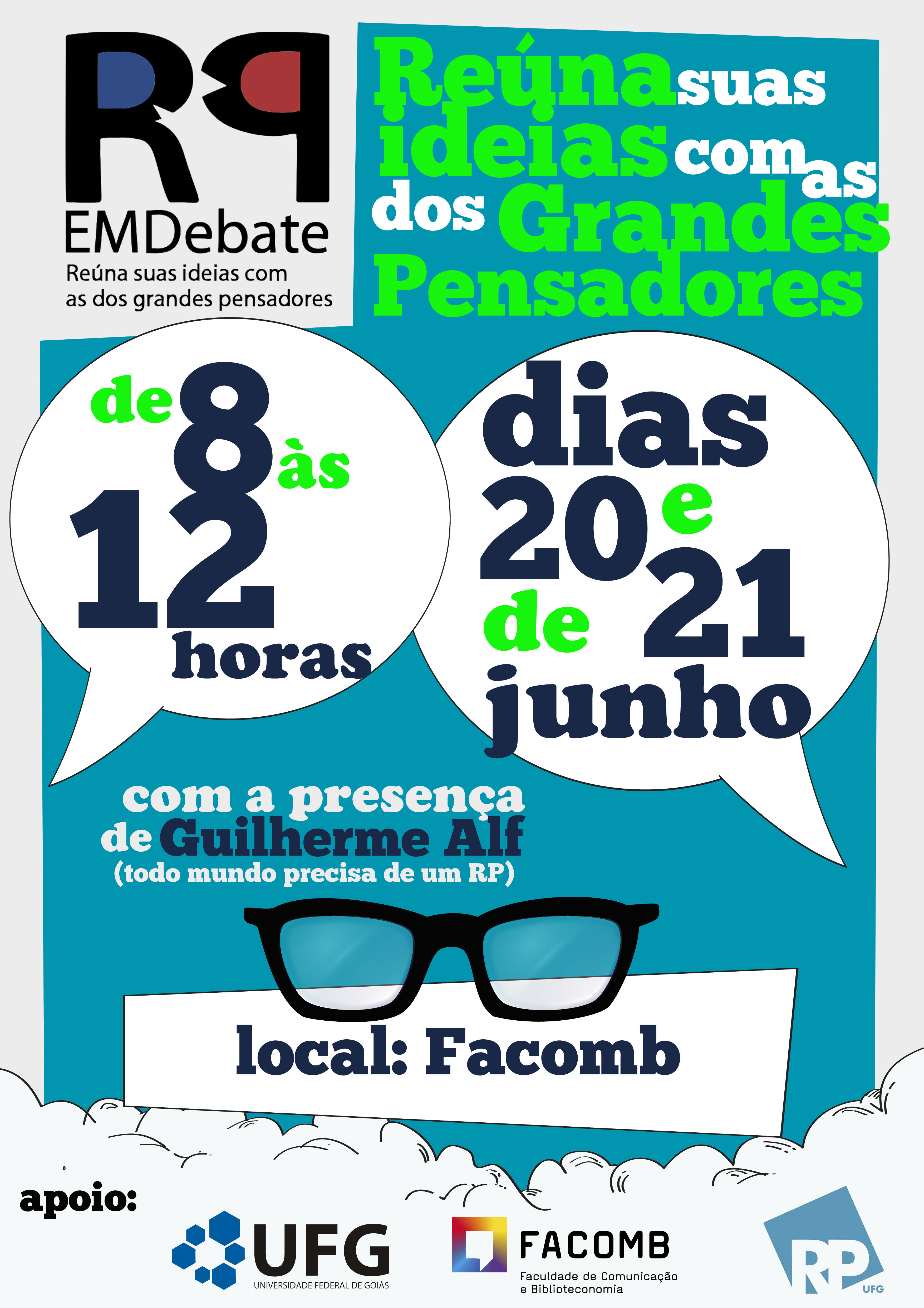 Será realizado nos dias 20 e 21 de junho a 9º edição do "RP em Debate", destinado aos alunos do curso de Relações Públicas da UFG. O Relações Públicas Guilherme Alf, autor do famoso vídeo “Todo mundo precisa de um RP” realiza a palestra de abertura às 8h30 no auditório da Faculdade de Comunicação e Biblioteconomia (Facomb), onde discute a realidade da profissão e relata sua experiência no mercado de trabalho. Para os participantes também serão oferecidas oficinas com profissionais da área.