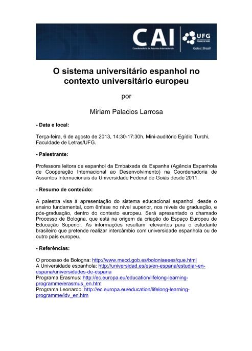 Palestra: O sistema universitário espanhol no contexto universitário europeu 事件 Local: Miniauditório da Faculdade de Letras 活动期间 : 05 , 2013 at 21:00 - 01 , 2013 at 12:41 Evento será nesta terça-feira, às 14h30 no Miniauditório da Faculdade de Letras da UFG TweetWhatsApp 全部列出 Back