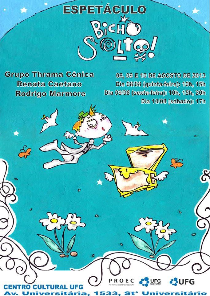 O Centro Cultural UFG apresenta na Série Todas as Artes a peça BICHO SOLTO, nos dias 08, 09 e 10 de agosto. A peça discute tema atual e muito presente que permeia as relações na escola e na vida em sociedade, o Bullying. A peça narra a trajetória de um personagem menino - chamado Ele – e toda uma constelação de situações criadas através da sua Imaginação. Dentro de uma caixa preta, Ele através de sua imaginação criativa advinda de leituras, cria um universo imaginário e vive este universo através de vários personagens que abordarão um tema cada um, relacionado ao Bullying: o cavaleiro Gordo que abordará a