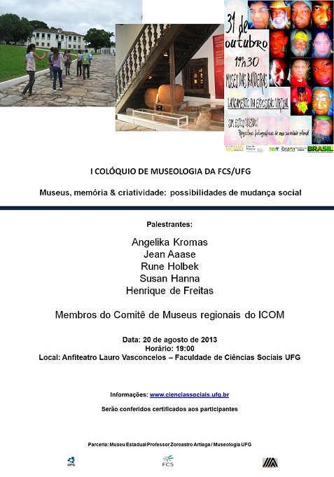 A Faculdade de Ciências Sociais realizará, no dia 20 de agosto, às 19h, o I Colóquio de Museologia da FCS/UFG - Museus, memória & criatividade: possibilidades de mudança social. O evento será realizado no Anfiteatro Lauro Vasconcelos, na Faculdade de Ciências Sociais. Serão conferidos certificados aos participantes. Mais informações podem ser obtidas no sítio www.cienciassociais.ufg.br