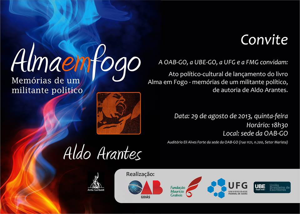 A Ordem dos Advogados do Brasil (OAB-GO), a União Brasileira dos Estudantes (UBE), A Universidade Federal de Goiás (UFG) e a Fundação Maurício Grabois (FMG) convidam para o ato político-cultural de lançamento do livro Alma em Fogo: memórias de um militante político, de Aldo Arantes. O evento será realizado no dia 29 de agoto, às 18:30h, na sede da OAB-GO.