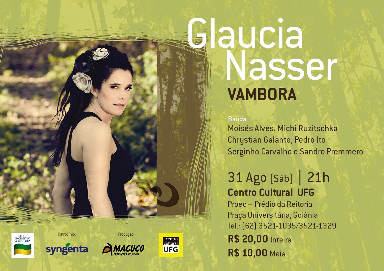 Uma das mais belas vozes da música brasileira, a cantora Glaucia Nasser fará show em Goiânia, no dia 31 de agosto, no Teatro Centro Cultural da Universidade Federal de Goiás (UFG). A apresentação faz parte da turnê de “Vambora”, seu quarto CD, que teve início em Miami (EUA), onde Glaucia se apresentou num projeto de uma série de concertos realizados pelo programa Fine Arts Concerts, da rádio WDNA 88.9 FM, emissora especializada em jazz e world music. A cantora já se apresentou em Porto Alegre, Teresina, Viçosa e Brasília. O próximo show será em Vitória (01/11).