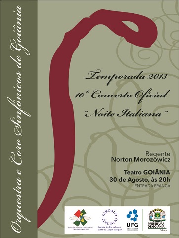 A UFG convida para a Noite Italiana, o 10° Concerto Oficial da Temporada 2013 da Orquestra e Coro Sinfônicos de Goiânia, que será realizado no Teatro Goiânia, sexta-feira, dia 30 de agosto, às 20h, com entrada franca.  A apresentação contará com a participação de solistas convidados, vindos da Itália, sob a regência do Maestro convidado Norton Morozowicz.