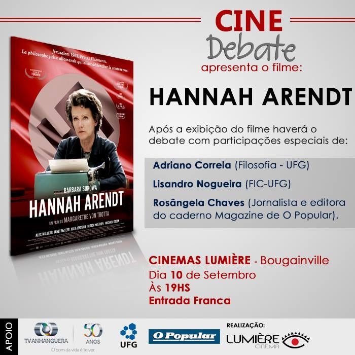O Projeto Cine Debate apresenta no dia 10 de setembro, às 19h, nos Cinemas Lumière do Shopping Bougainville um debate sobre o filme: Hannah Arendt. Participarão do debate os professores Adriano Correia, do curso de Filosofia, e Lisandro Nogueira, da Faculdade de Informação e Comunicação, além da jornalista e editora Rosângela Chaves. A entrada é franca.