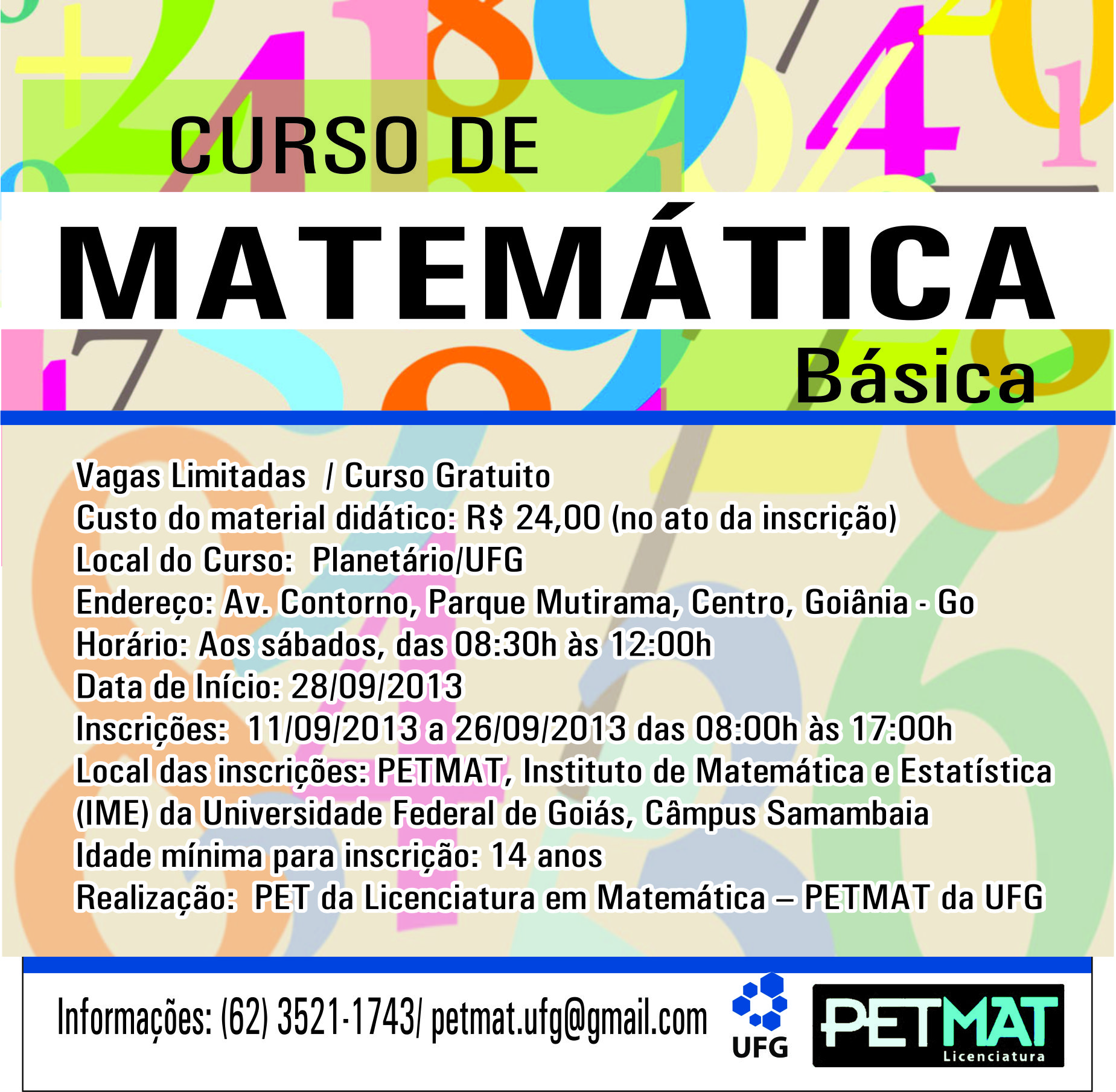 O Instituto de Matemática abre inscrições para o curso de Matemática Básica para a comunidade geral. Trata-se de um curso de matemática básica para aqueles que possuem dificuldades nesta disciplina. Sua ementa é referente aos conteúdos do ensino fundamental. As inscrições vão de 11/09 até o dia 26/09. O curso é gratuito, com custo de R$ 24 reais referente ao material didático. A data de início é 28/09 e as aulas serão aos sábados, das 8:30h às 12h.