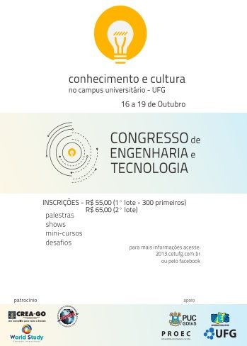 O Congresso de Engenharia e Tecnologia (CET) é um evento de caráter técnico-científico e cultural, criado no ano de 2011 como um projeto arrojado viabilizado pelos discentes dos cursos de Engenharia, Arquitetura e dos demais cursos tecnológicos da Universidade Federal de Goiás. Sua 3ª edição terá como tema CONHECIMENTO E CULTURA.