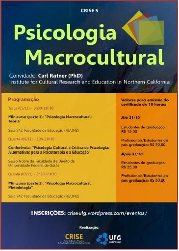 Crise 5 - Psicologia Macrocultural 事件 Local: Faculdade de Educação e Faculdade de Direito/UFG 活动期间 : 04 - 06 , 2013 TweetWhatsApp 全部列出 Back