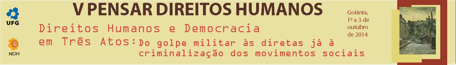 O V Seminário Pensar Direitos Humanos terá como tema Direitos Humanos e Democracia em Três Atos: Do Golpe Militar às Diretas Já à Criminalização dos Movimentos Sociais.  O evento, realizado pelo Núcleo Interdisciplinar de Estudos e Pesquisas em Direitos Humanos e pelo Programa de Pós-Graduação Interdisciplinar em Direitos Humanos (PPGIDH), acontecerá nos dias 1º a 3 de outubro, no prédio da Faculdade de Ciências Sociais (FCS), Câmpus Samambaia. As inscrições são gratuitas e serão realizadas na página eletrônica: eventos.ufg.br/VPensarDH2014. Para mais informações ligue: (62) 3209-6022.